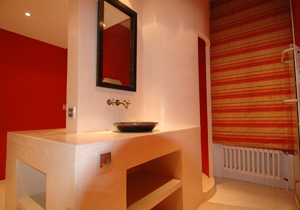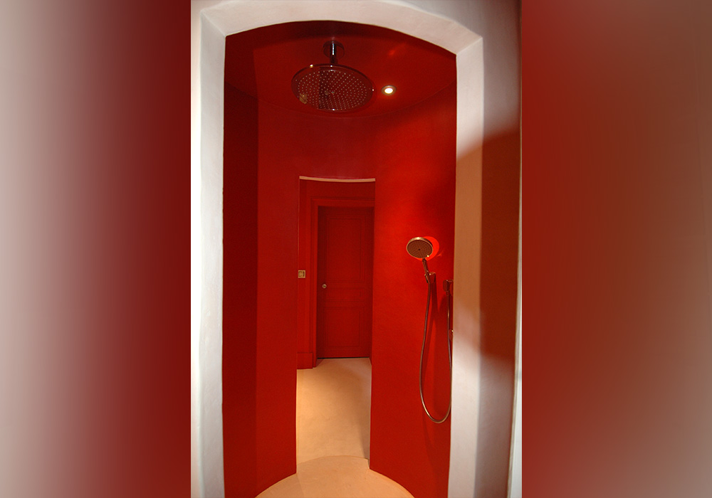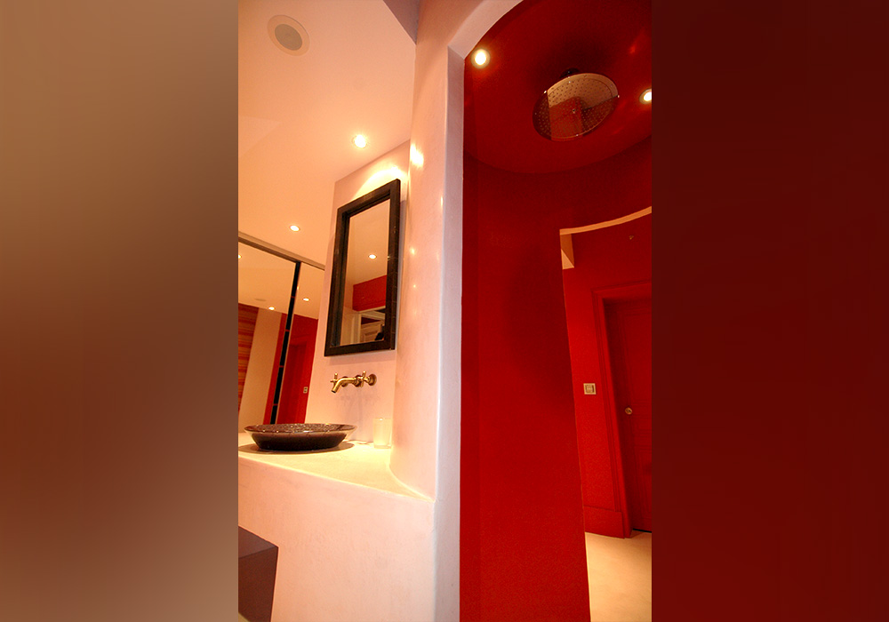Réalisation d’une salle de bains. Création d’un volume central monolithique réalisé en résine comportant des vaques en vis a vis disposées de façon à préserver l’intimité de chacun et une douche circulaire offrant un double accès. Couleur crème et rouge conférant à l’ensemble douceur et chaleur.